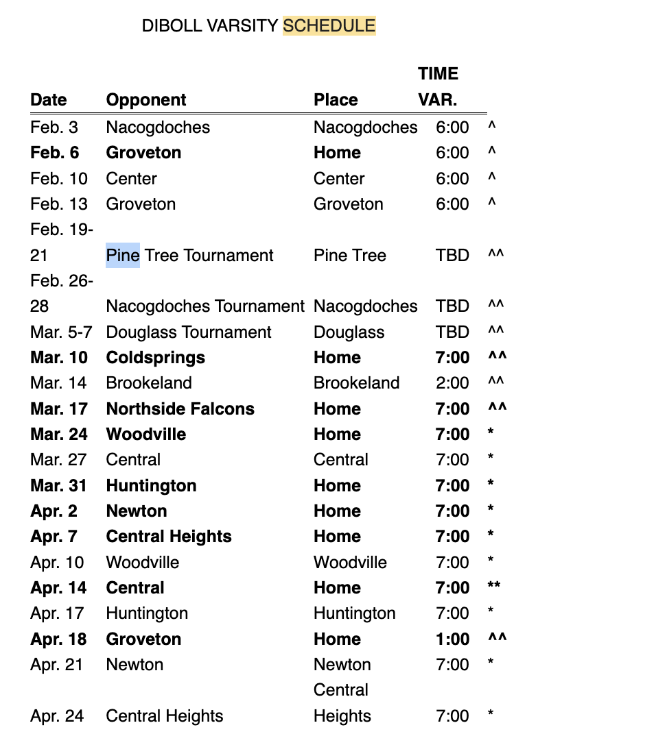 | Diboll Lumberjacks | 0 | 0 | 0 | 0 | 0 | |