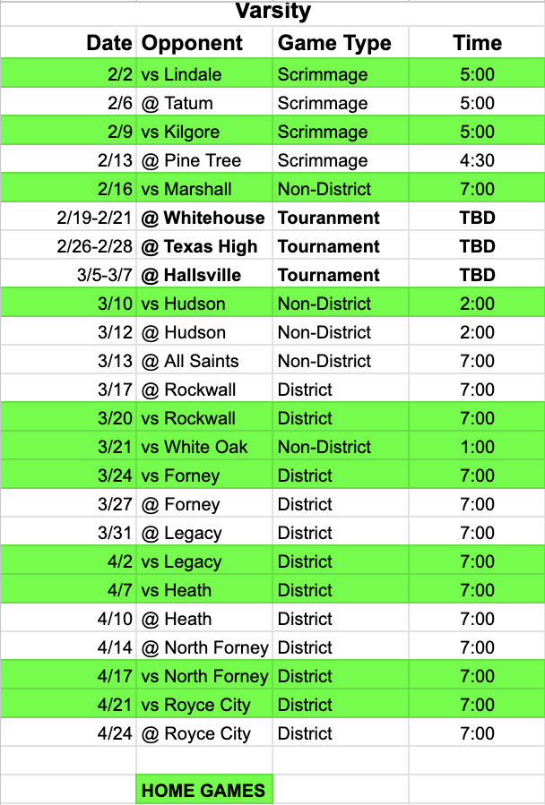 | Rockwall Yellowjackets | 0 | 0 | 0 | 0 | 0 | |