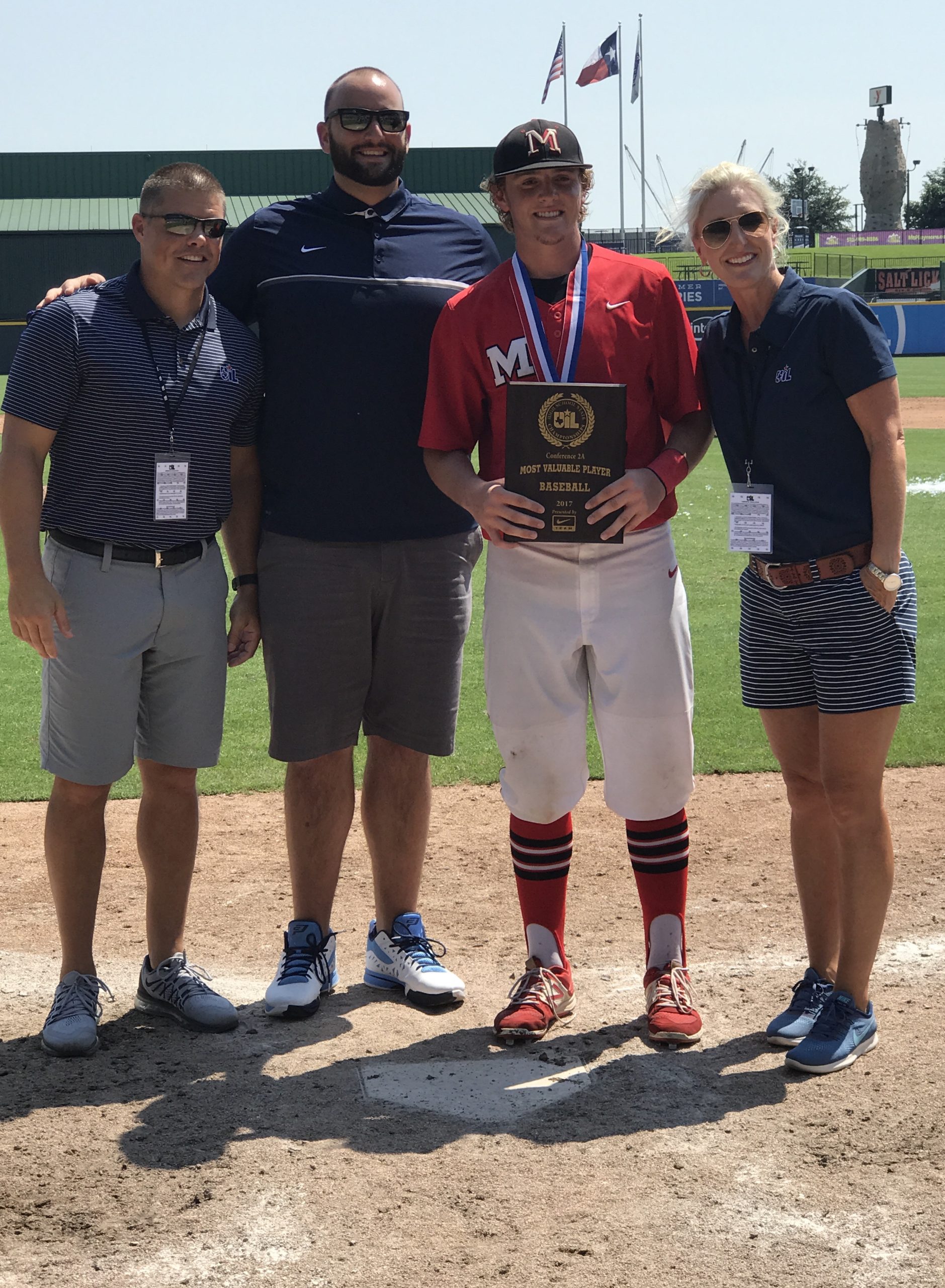 With the wind blowing slightly from left field to right field, the visiting Muenster Hornets would wearing orange with white letters. Big Sandy, the home team, would wear their whites with purple sleeves and letters. The 2017 2A State Championship game had begun. Muenster’s Dallas Baptist Comitt Blayne Jones would square off with Alvin JC Committ Bryce Holmes. The records no longer mattered, today, one team would be crowned the 2A State Champions.