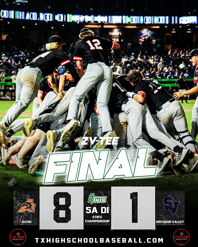 Aledo banged out 11 hits, scoring 8 runs and Devin Miller held Smithson Valley to one run as Aledo ran away with a 8-1 win to capture the 2025 5A Division I State Championship. It was Aledo’s 2nd State Championship but it had been more than 10 years since they were last here, 11 years since the last championship.