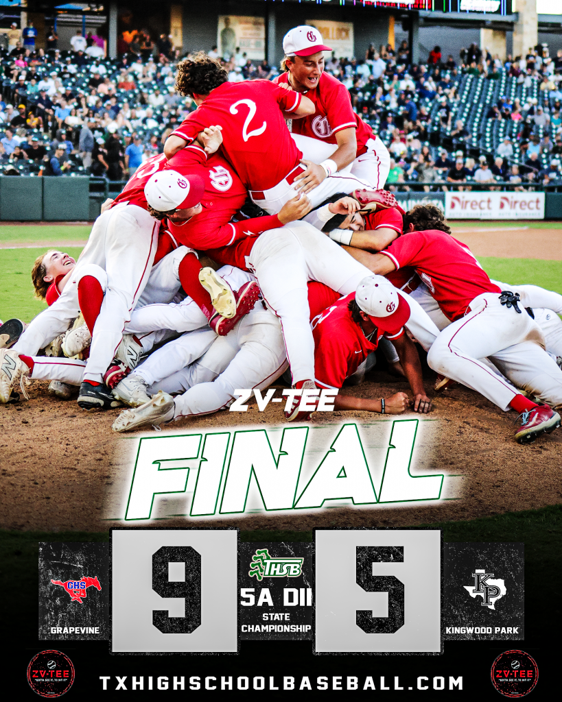 In what seemed more like a boxing match in the first 3 1/2 innings with the two opponents exchanging blows, Grapevine prevailed with the final blows, scoring the last 5 runs of the game and coming away with a 9-5 win and the first 5A Division II State Championship. It was Grapevine’s second consecutive state championship.