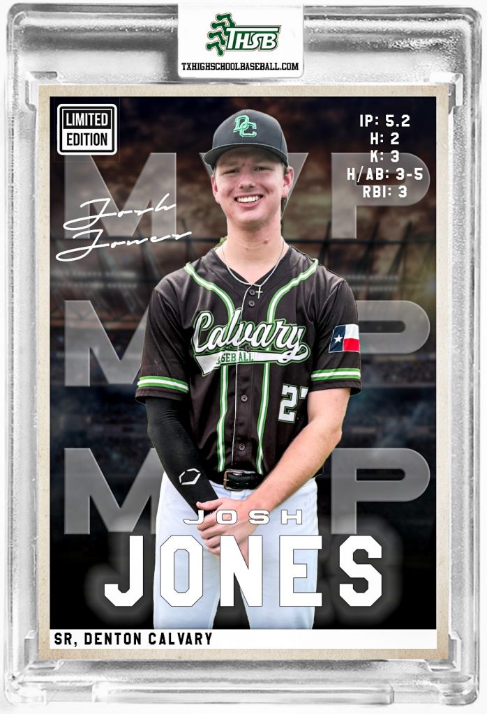 Josh Jones came in to pitch for Denton Calvary in the first inning with one out and the bases loaded and finished the game for the Lions. He pitched 5.2 innings, gave up 2 hits, 1 unearned run and struck out 3 batters with no walks. He was also 3-5 at the plate with 3 RBIs. He was named the THSB MVP for the game.