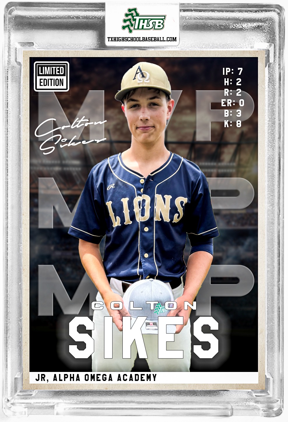 After giving up 2 unearned runs in the first, Sikes settled down giving up only one more hit the rest of the way and never allowed a runner past 2nd Base, In 7 innings, he gave up 2 hits, 2 unearned runs, struck out 8 batters and walked 3. He was named the THSB MVP of the Game.