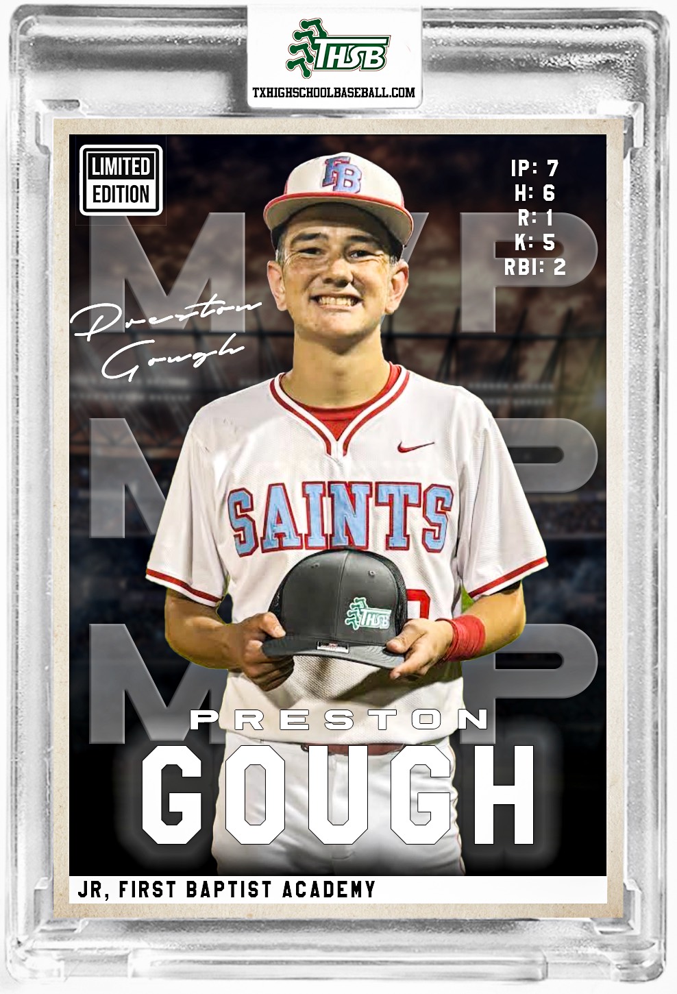 Gough secured the win by shutting down Ovilla Christian in the bottom of the 7th with two strikeouts and a ground out that he fielded. He pitched all 7 innings, gave up just one run on 6 hits, struck out 5 and walked only 2. Gough also had the 2 RBI single in the 2nd inning that gave First Baptist the lead for good. He was named the THSB MVP for the game,