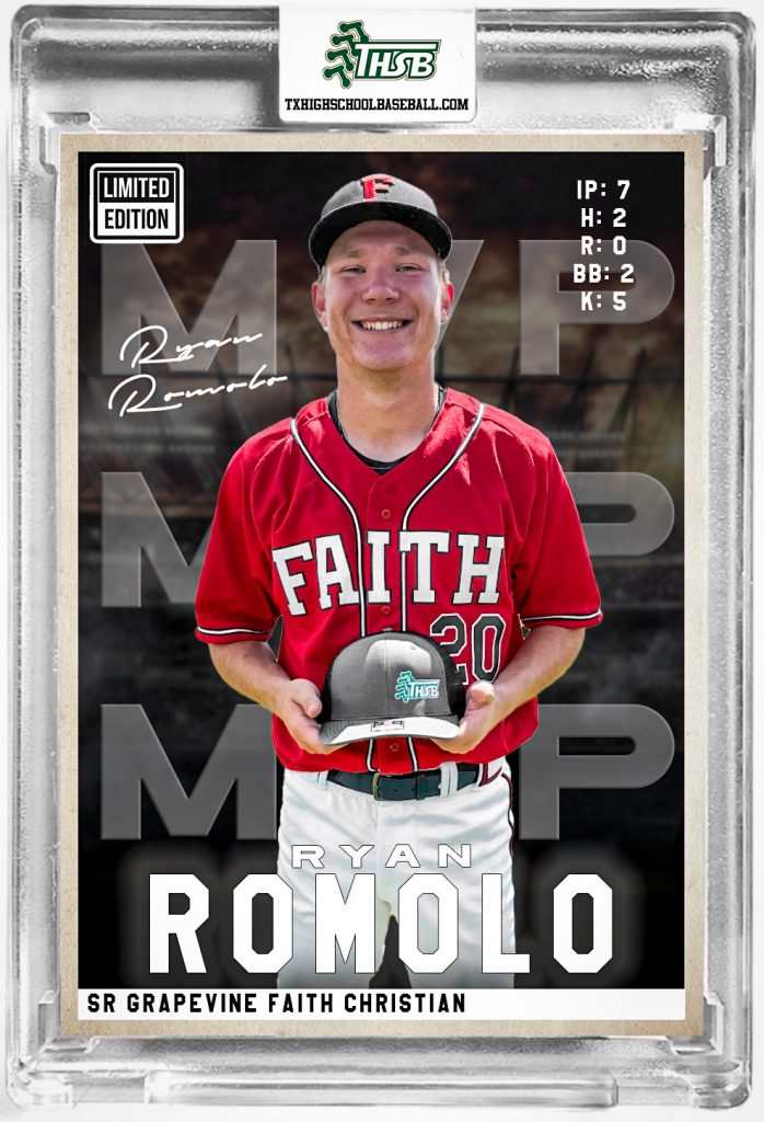 Romolo pitched all 7 innings, holding Southwest Christian to 0 runs on just 2 hits with 5 strikeouts and only 2 walks. He was named the THSB MVP of the game.