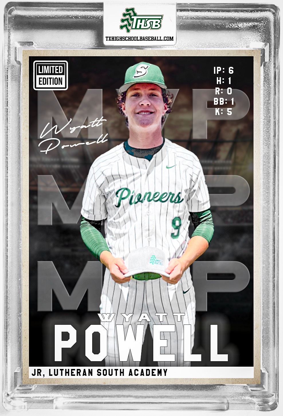 Even though they had beaten Houston Second Baptist twice, Lutheran Coach Aaron Schneider told his players to forget the past and take of the day. Jr Wyatt Powell led the way as he held Second Baptist to 1 hit in 6 innings as Lutheran South won 6-0 to advance to the TAPPS Division 4 State Championship Game.