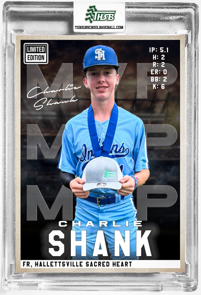 Charlie Shank was named the THSB Championship Game MVP. Shank’s line on the day was 5.2 IP, 4 Hits, 2 Unearned Runs, 6 strikeouts and 2 walks.
