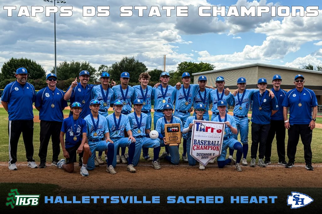 Hallettsville Sacred Heart has been a familiar face at the TAPPS Baseball State Tournament but winning the state title has eluded them over the last 6 years. This year they got solid pitching and timely hitting and benefitted from some free passes to win over First Baptist Academy 7-3 and capture the 2025 TAPPS Division 5 State Championship.