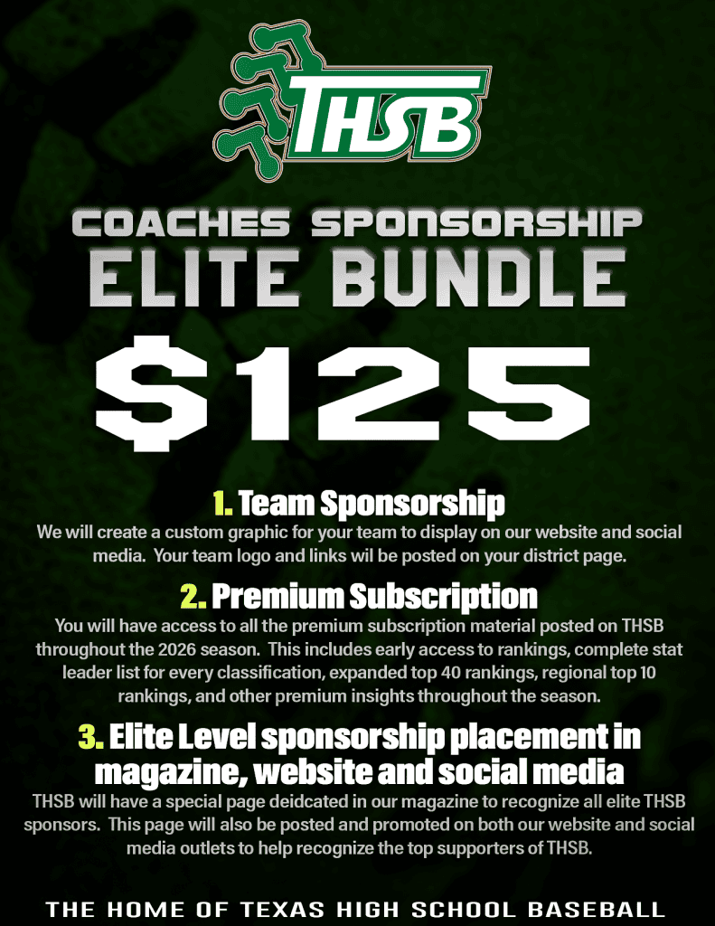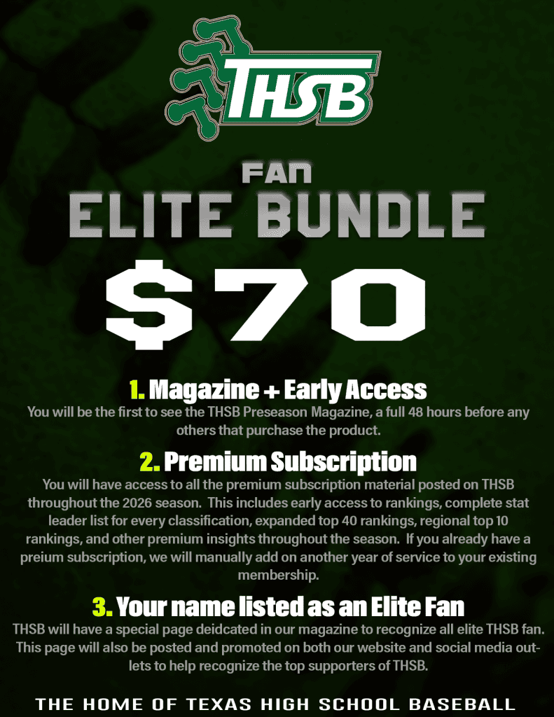 Become a subscriber to TX High School Baseball’s premium content to unlock access. Annual plans are $55 per year (365 day membership from time of sign-up) with discounts available to coaches.