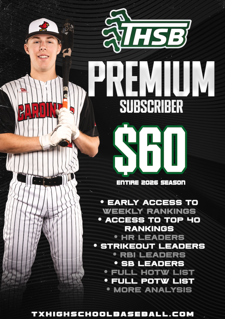 Become a subscriber to TX High School Baseball’s premium content to unlock access. Annual plans are $60 per year (365 day membership from time of sign-up) with discounts available to coaches.